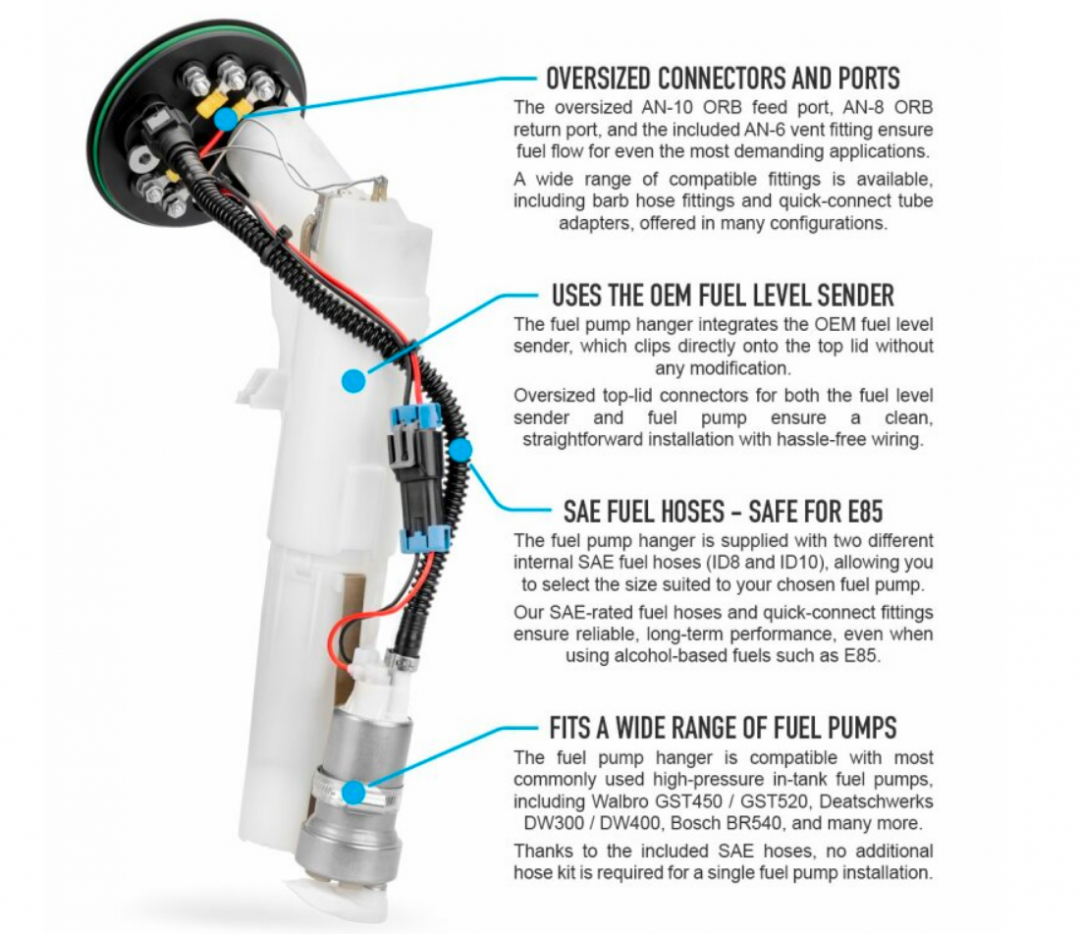 Bränslepumphängaren är utformad för att stödja populära högtrycksbränslepumpar för eftermarknaden, såsom Walbro GST450 och GST520 och Bosch BR540. Med de två medföljande interna bränsleslangarna behövs ingen extra slangsats när man använder en enda eftermarknadsbränslepump.